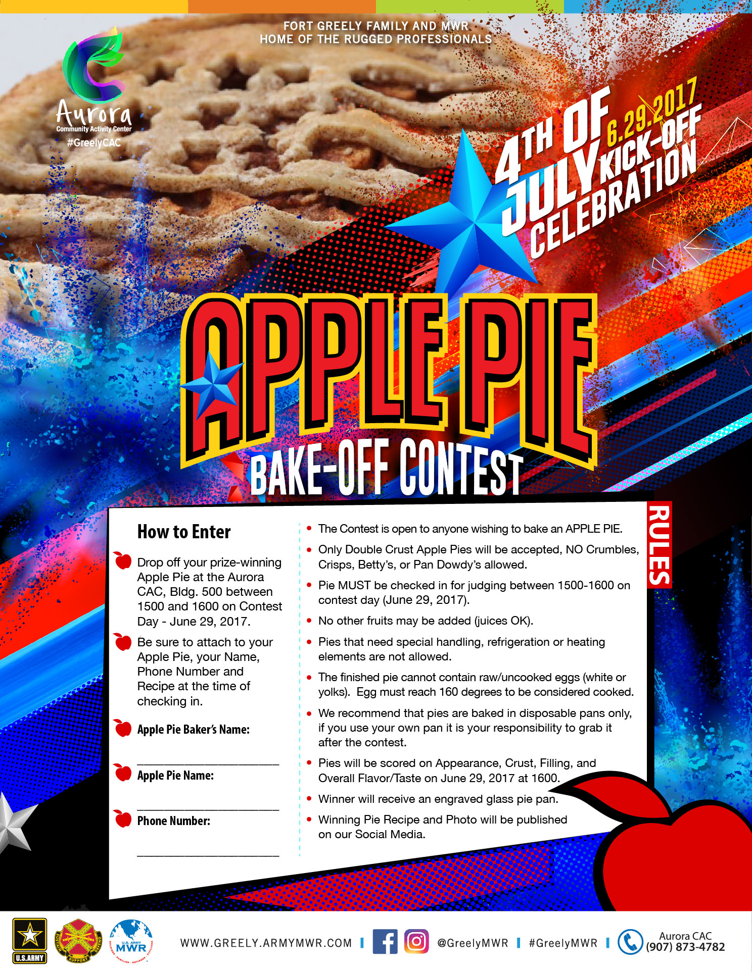 - The celebration will start with the 4th of July Apple Pie Baking Contest where you can test out your favorite recipe on the judges by entering your apple pie into the competition.