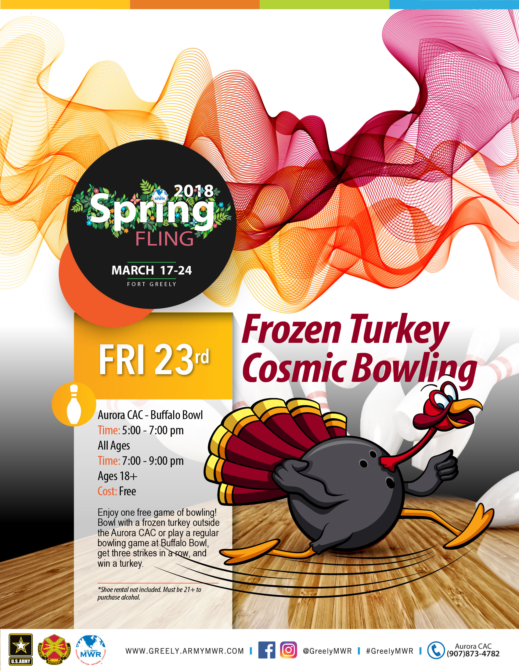 Enjoy one free game of bowling! Bowl with a frozen turkey outside the Aurora CAC or play a regular bowling game at Buffalo Bowl, get three strikes in a row, and win a turkey.