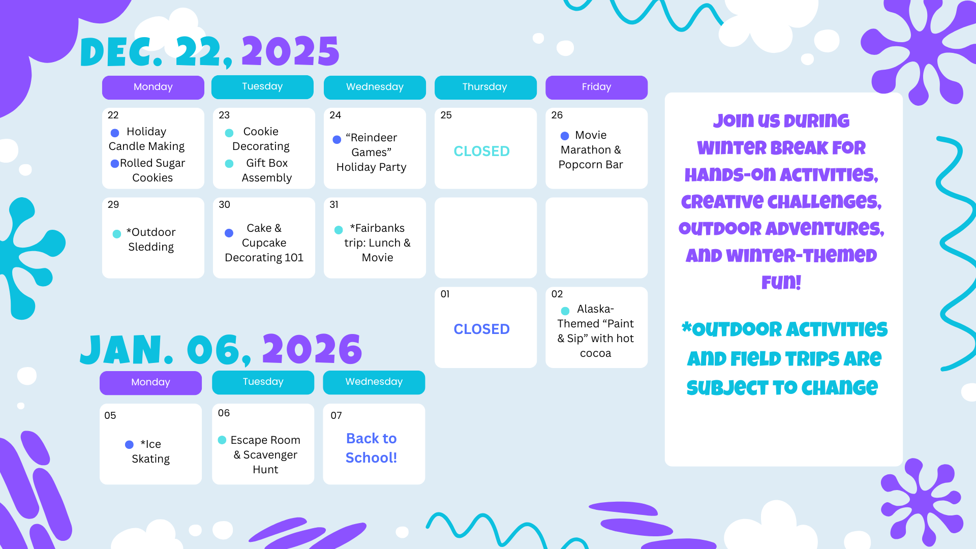 Check out the fun winter break activities happening at the Youth Center below such as Reindeer games and cookie decorating!